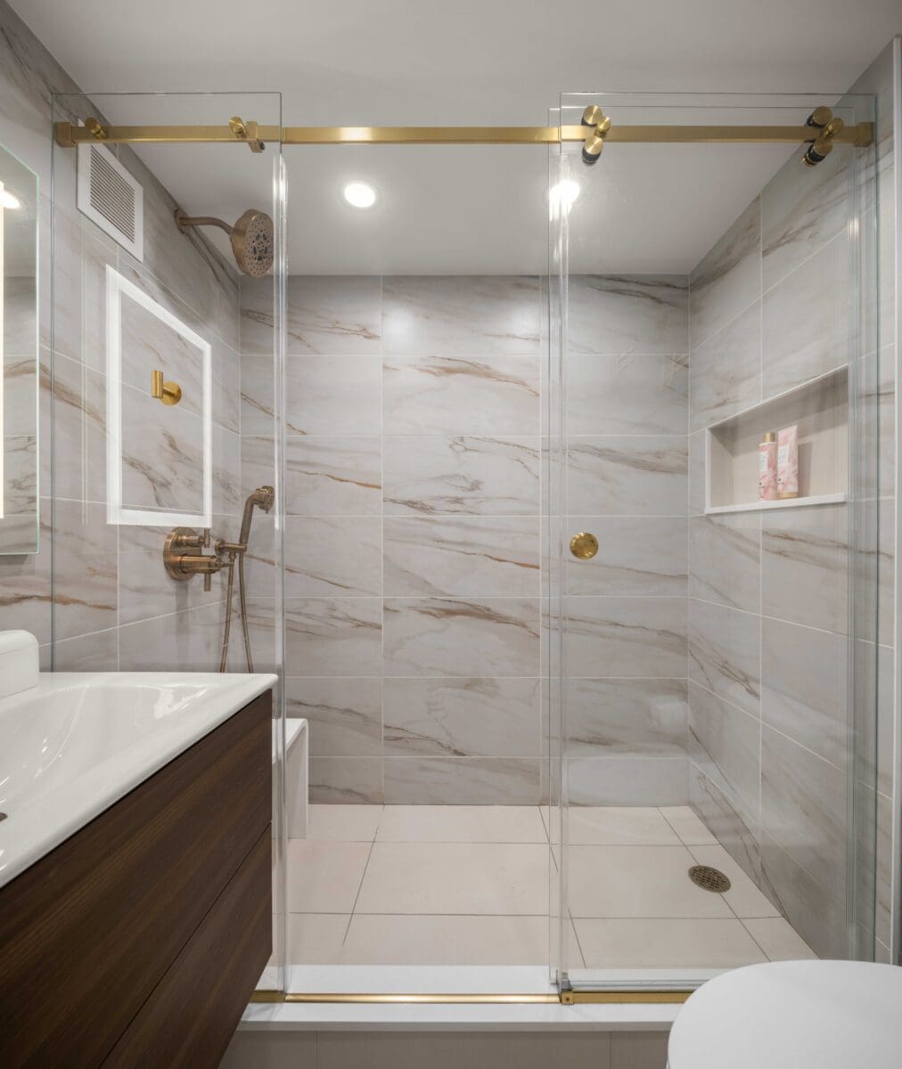 Bathroom Redesign: We crafted a spa-like bathroom retreat by installing marble-inspired tiles, a custom-built floating vanity, and a luxurious glass-enclosed walk-in shower with brass accents. Thoughtfully placed recessed shelving enhances both functionality and design.