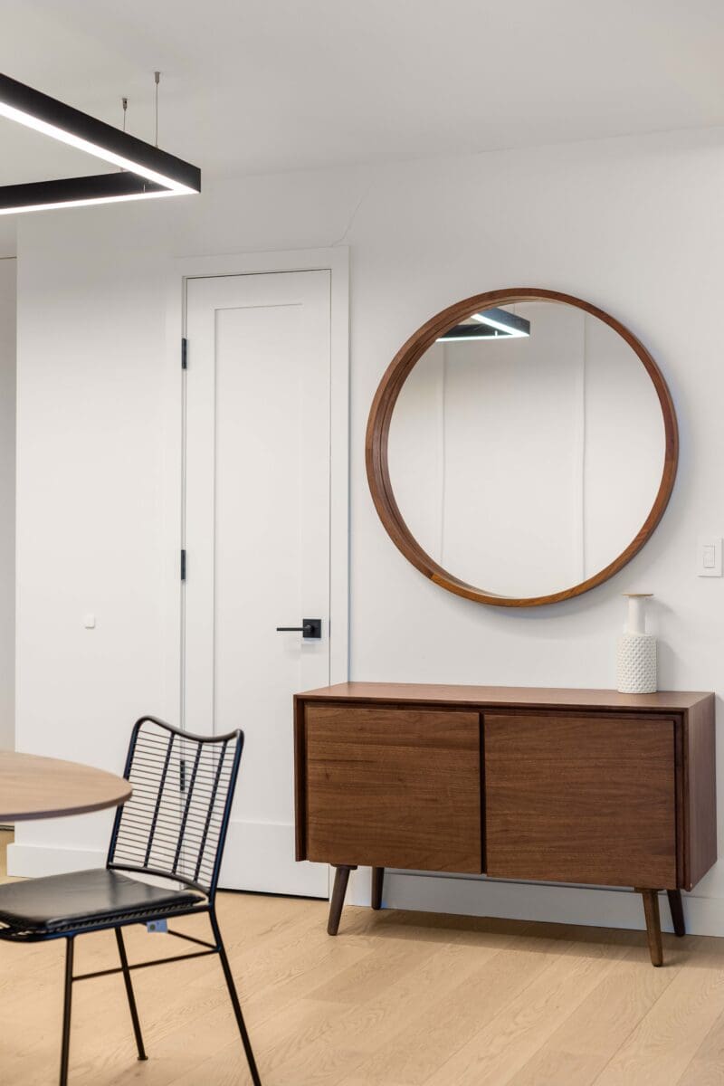 Dining Area Upgrade: The dining space now features a sophisticated wood dining table paired with chic, modern chairs. A statement light fixture anchors the space, while the open layout allows for seamless transitions between the living and dining areas, making it perfect for hosting.