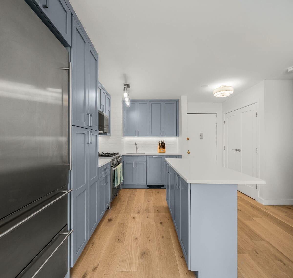 For this Gramercy Park kitchen renovation, NYKB focused on creating a serene yet modern atmosphere with custom cabinetry in a soft blue finish. The floor-to-ceiling cabinets maximize storage while maintaining a streamlined, cohesive look. The subtle blue tones enhance the space, contributing to the kitchen’s contemporary design.