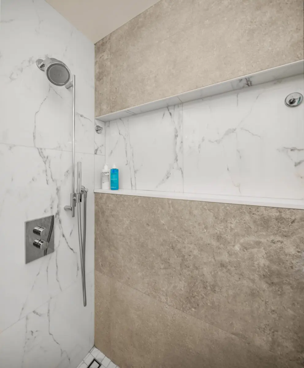 The bathroom remodeling brought a sense of spa-like calm to the home, using a neutral palette and natural textures to create a soothing retreat. A glass-enclosed walk-in shower was constructed with large-format porcelain tiles in a marble finish, accented by warm stone details that add depth and character. The new vanity echoes the kitchen’s wood tones and is topped with a sleek, integrated sink. Above it, a mirrored medicine cabinet with built-in lighting enhances storage and brightens the space. Chrome plumbing fixtures were selected for their clean lines and timeless appeal, while half-wall tile installation adds both style and practicality.