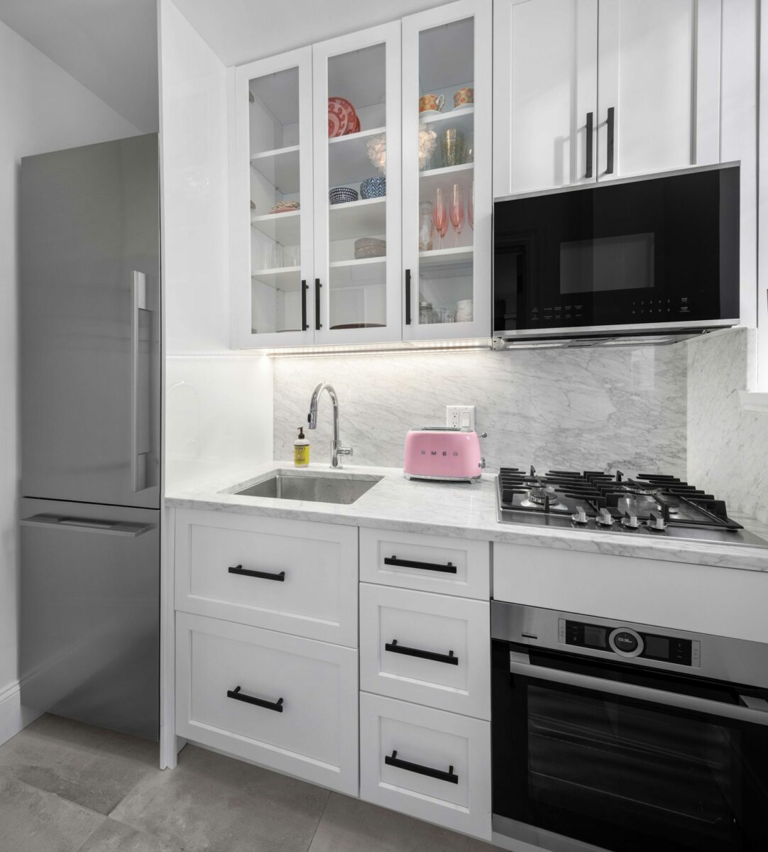 The kitchen now features Ultracraft Cabinetry from the MDF Series with the Avon Door Style, offering a perfect balance of minimalist charm and practical storage solutions. The Scalea Vanata Carrara countertops and backsplash, crafted with a polished eased edge, add a touch of elegance and continuity to the space. Neutral tones and subtle textures bring sophistication, complemented by soft under-cabinet lighting to enhance functionality and ambiance.