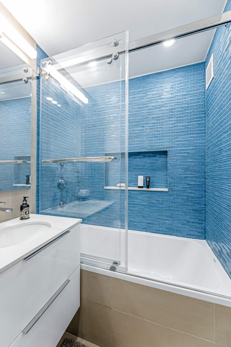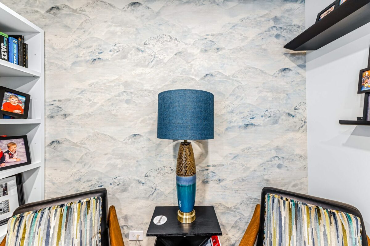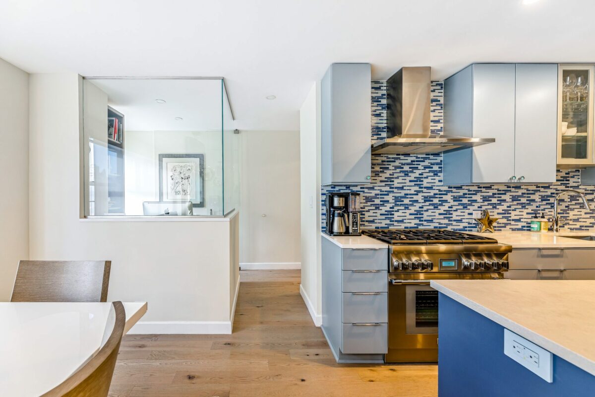 The home renovation incorporates a sophisticated color palette of neutrals and bold accents. The kitchen’s striking blue cabinetry and backsplash create a vibrant focal point, while soft gray tones in the living room’s custom built-ins pair beautifully with the teal velvet sofa. Light wood floors add warmth and continuity throughout, enhances visual interest. Each material was carefully chosen to complement the home’s contemporary style while adding depth and character.