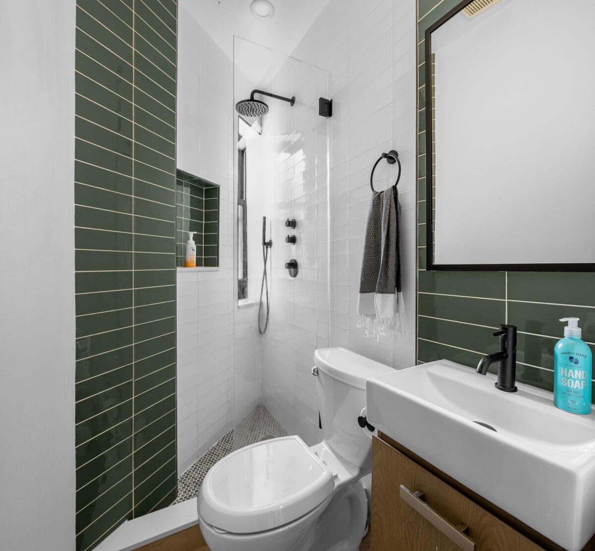 Sustainability was central to the renovation, with eco-friendly materials and refinished hardwood floors adding warmth and cohesion to the space. Green and white accents flow harmoniously through the home, including the bathroom, which features timeless tiling, matte black fixtures, and a frameless glass shower, blending style with functionality.
