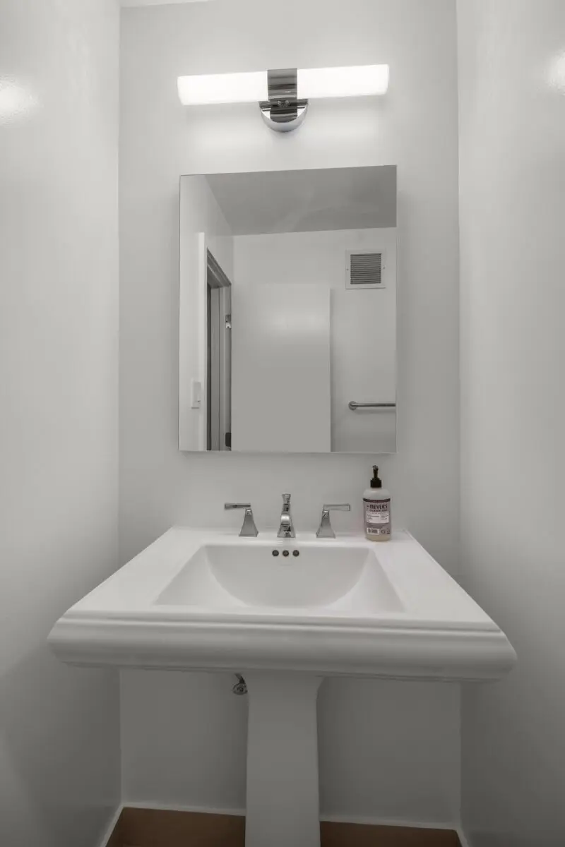 - Powder Room Refinement – Classic pedestal sink with chrome fixtures and minimalist lighting.